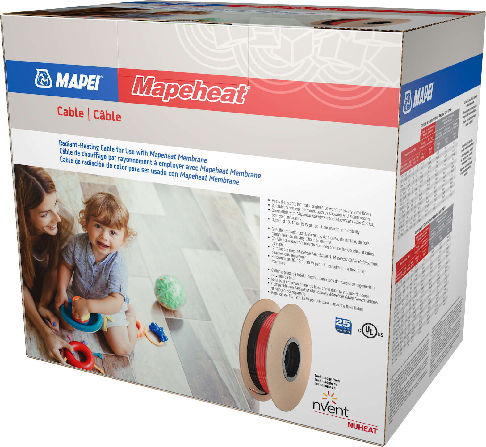Mapeheat Cable is a free-form, twisted-pair, floor-heating cable for use in any residential interior room where the comfort of radiant floor heating is desired. The cable can be spaced on site to provide 10, 12 or 15 W per sq. ft. based on the desired wattage output requirements of the installation. Mapeheat Cable is available in 33 lengths to accommodate areas as small as 6 sq. ft. (0.56 m²) and up to 293 sq. ft. (27.2 m²).